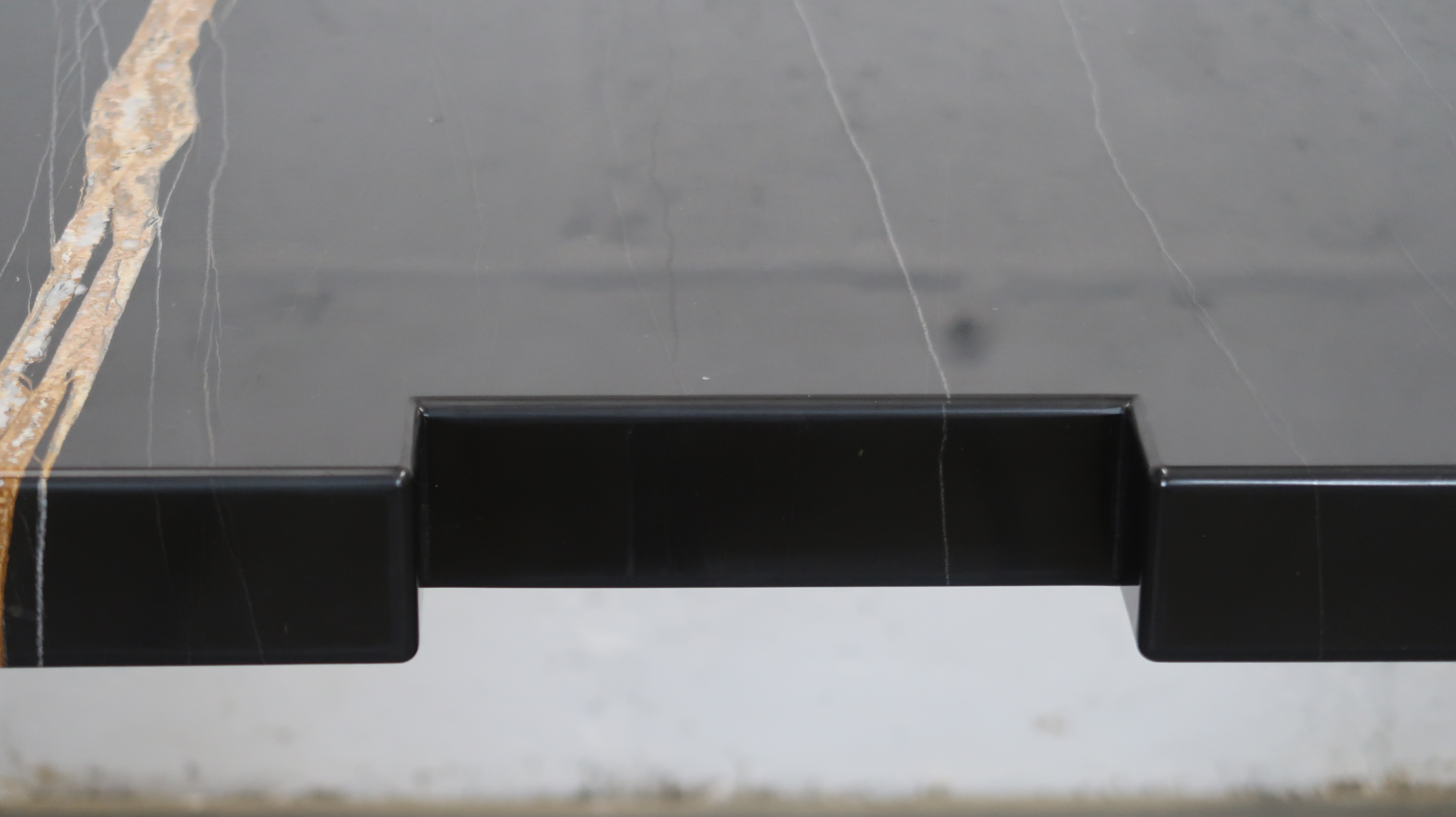 The top is a Sahara Noir Marble with cable cut outs to the back. The top has an 80mm marble downstand.