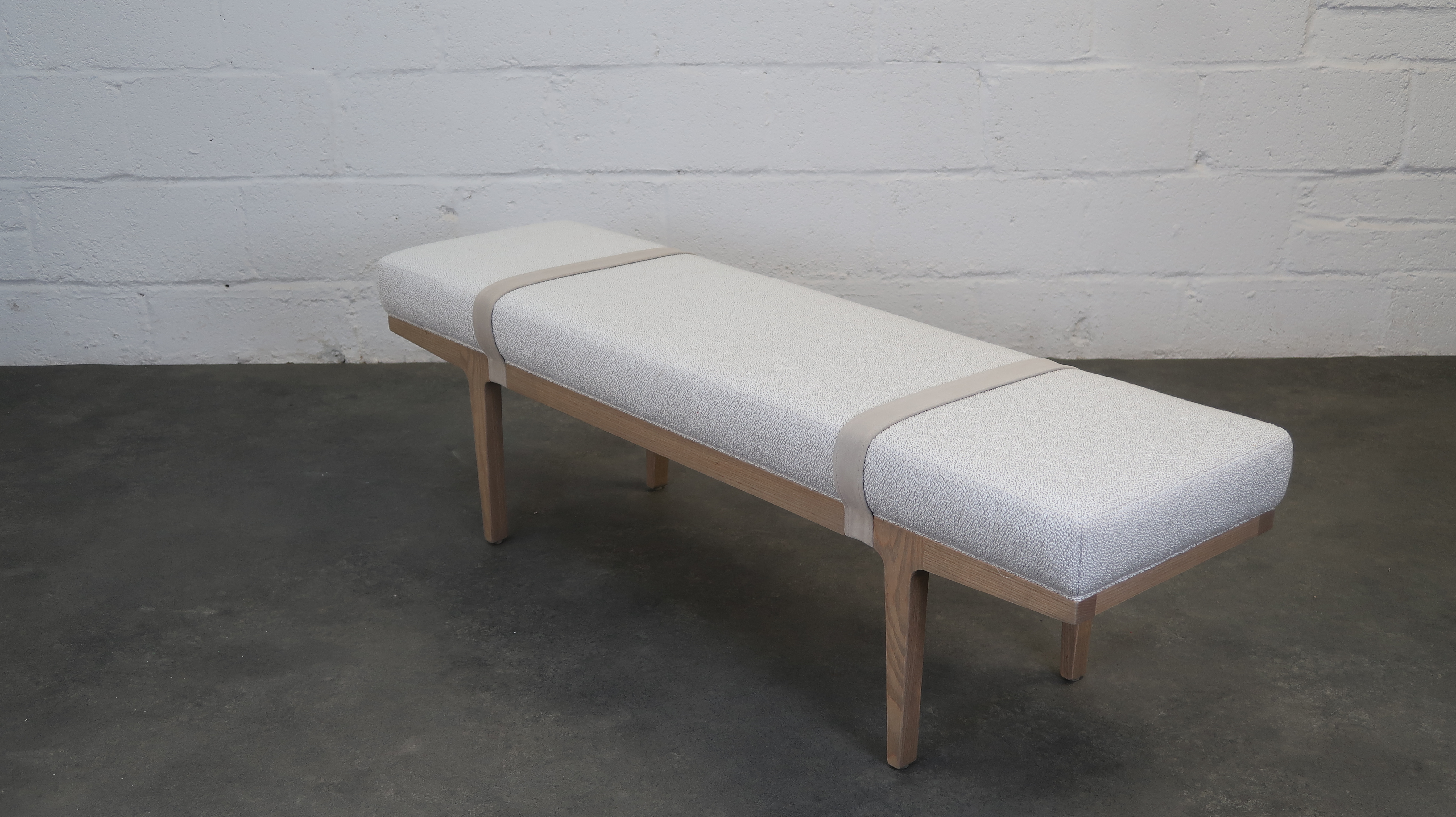 An upholstered end of bed bench (or hallway!) with a light stained Ash frame.