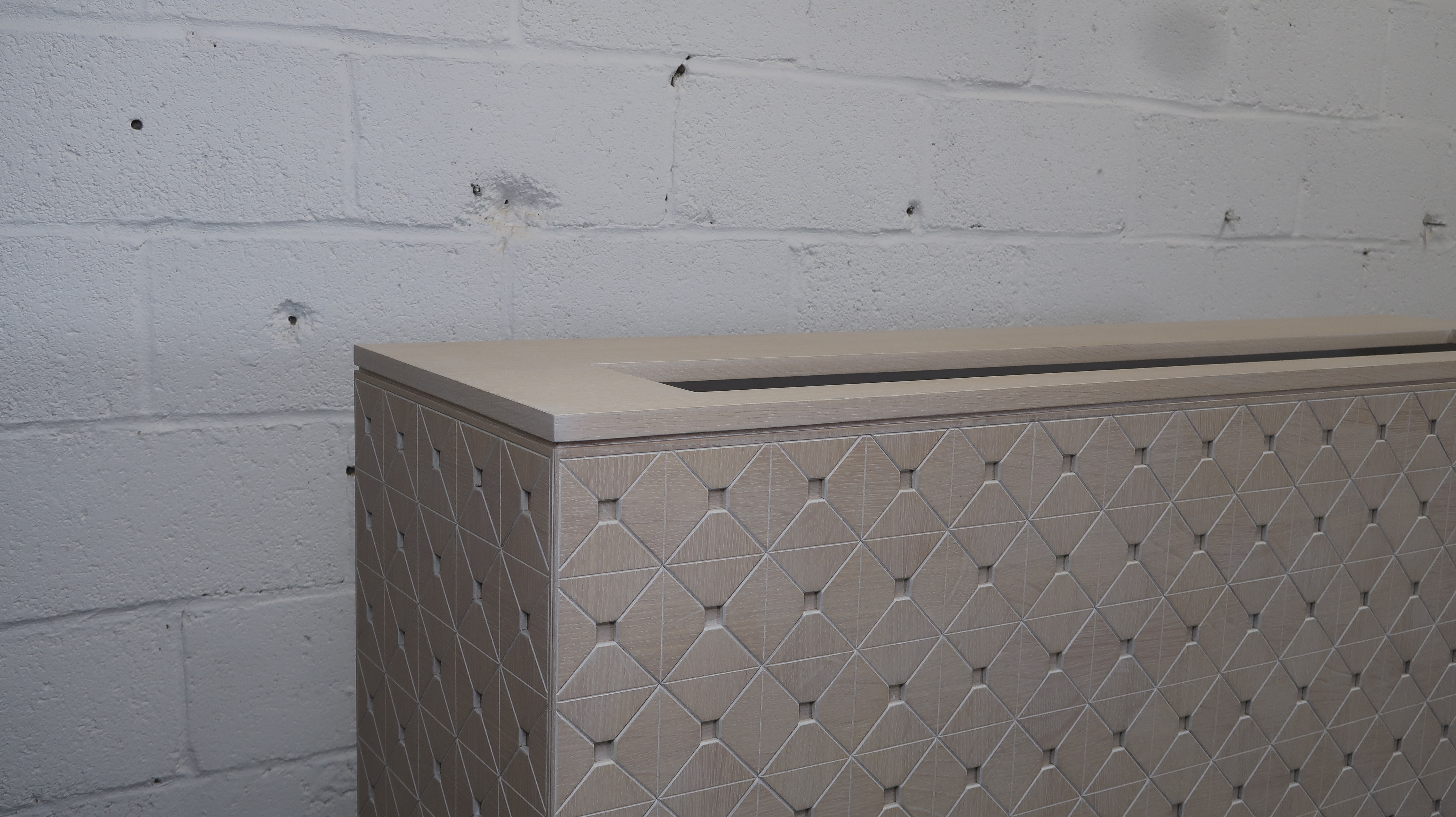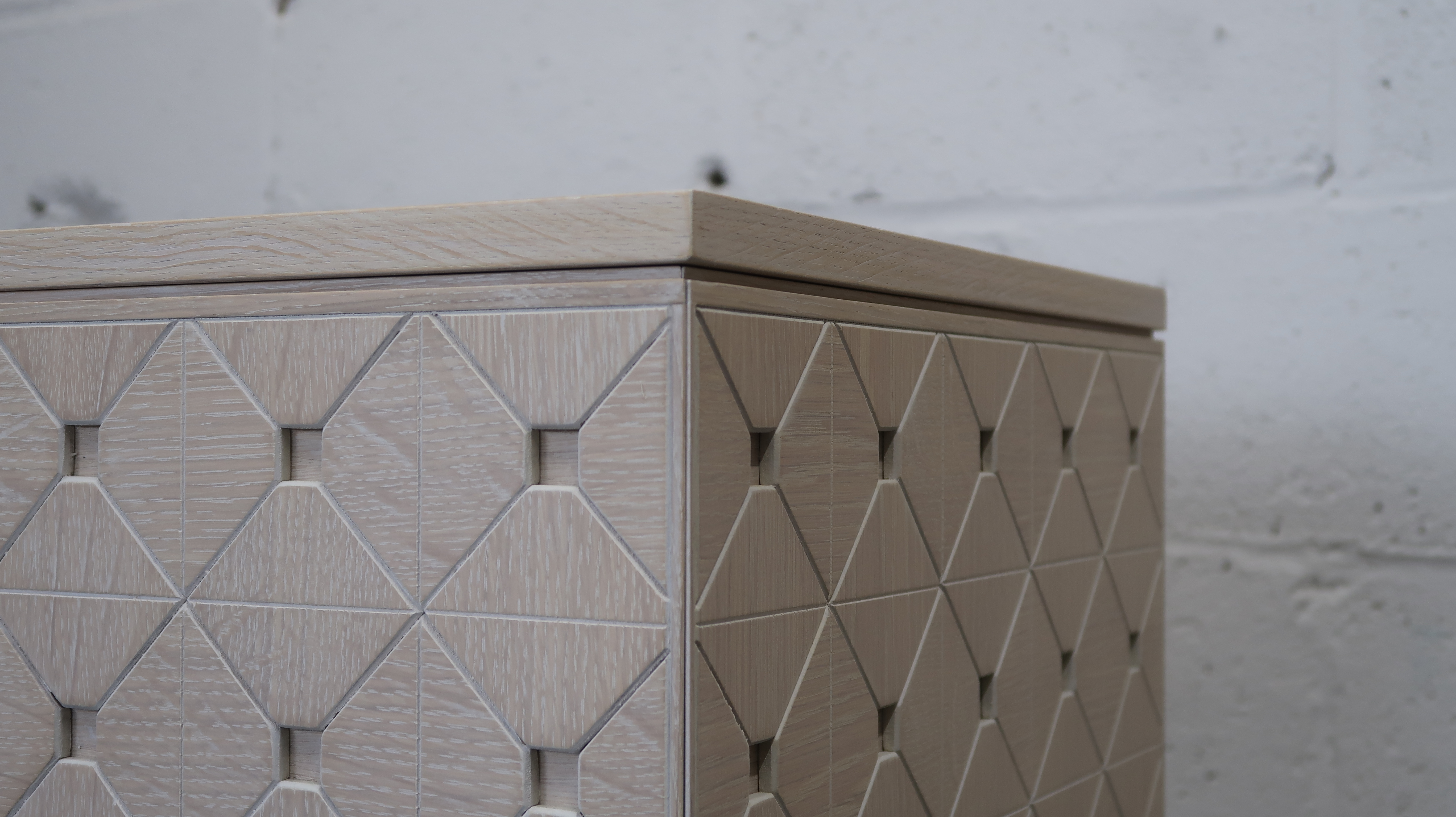 Each individual shape was cut out on our CNC and then put together like a puzzle to create this striking pattern on all 4 sides of the piece.